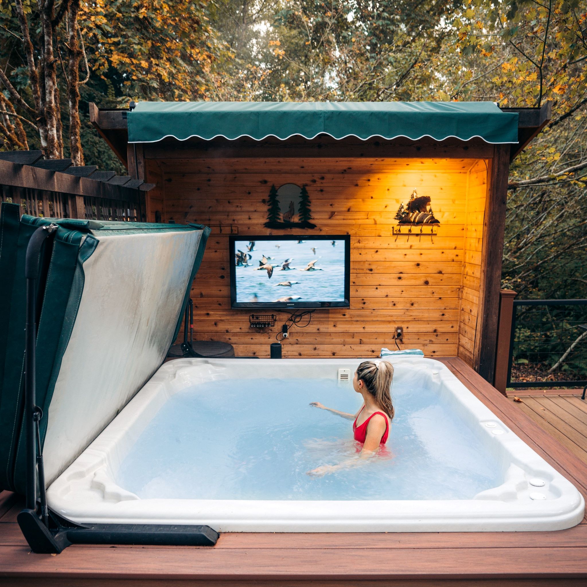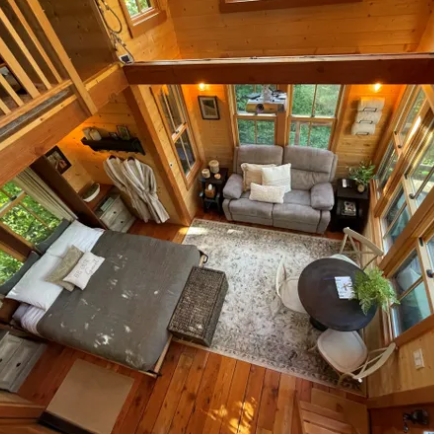 The Treehouse includes a private hot tub, a queen bed, a reclining couch, and twin bunk beds in the loft (accessible by ladder). Amenities include an outdoor hot shower, a private half bath, Wi-Fi, a 100-inch screen with a projector, a mini-fridge, a microwave, and a Keurig coffee maker.